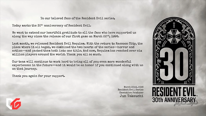 شرکت CAPCOM در تاریخ ۲۲ مارس ۲۰۲۶ به مناسبت ۳۰مین سالگرد فرنچایز Resident Evil طی پیامی از طرفداران برای حمایت‌شان قدردانی کرد.